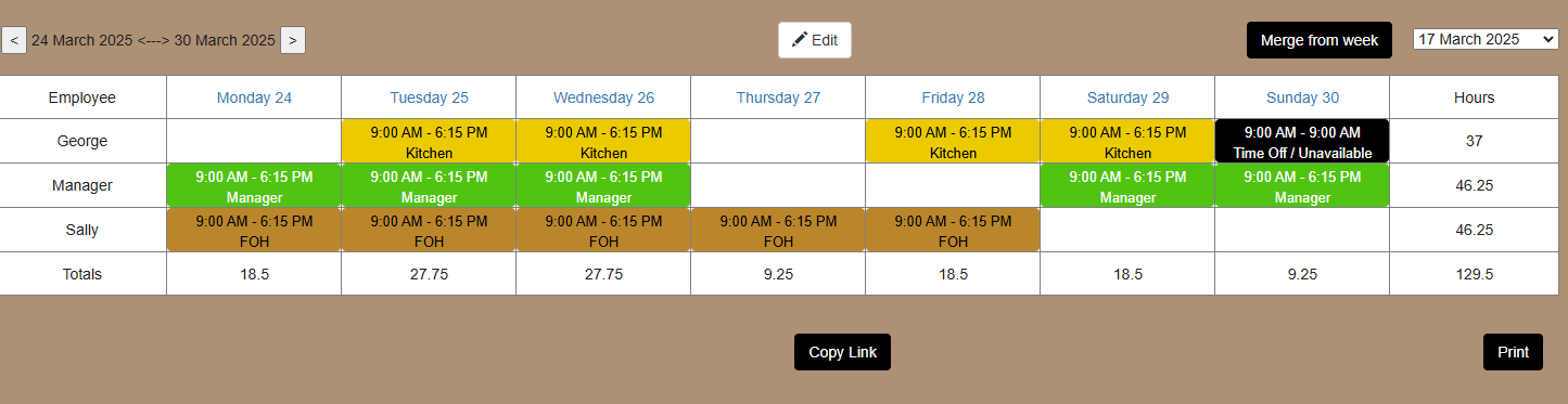 Roster your staff, understand the daily and weekly hours and outline jobs and roles.